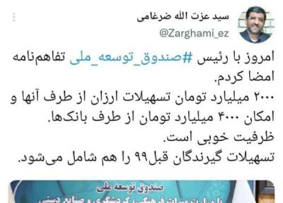 مهندس سید عزت الله ضرغامی در توئیتی از امضای تفاهم نامه با رئیس صندوق توسعه ملی و پرداخت 6هزار میلیارد تومان تسهیلات به فعالان گردشگری همچنین پرداخت تسهیلات برای بازسازی و تجهیزات هتل های قدیمی خبر داد.